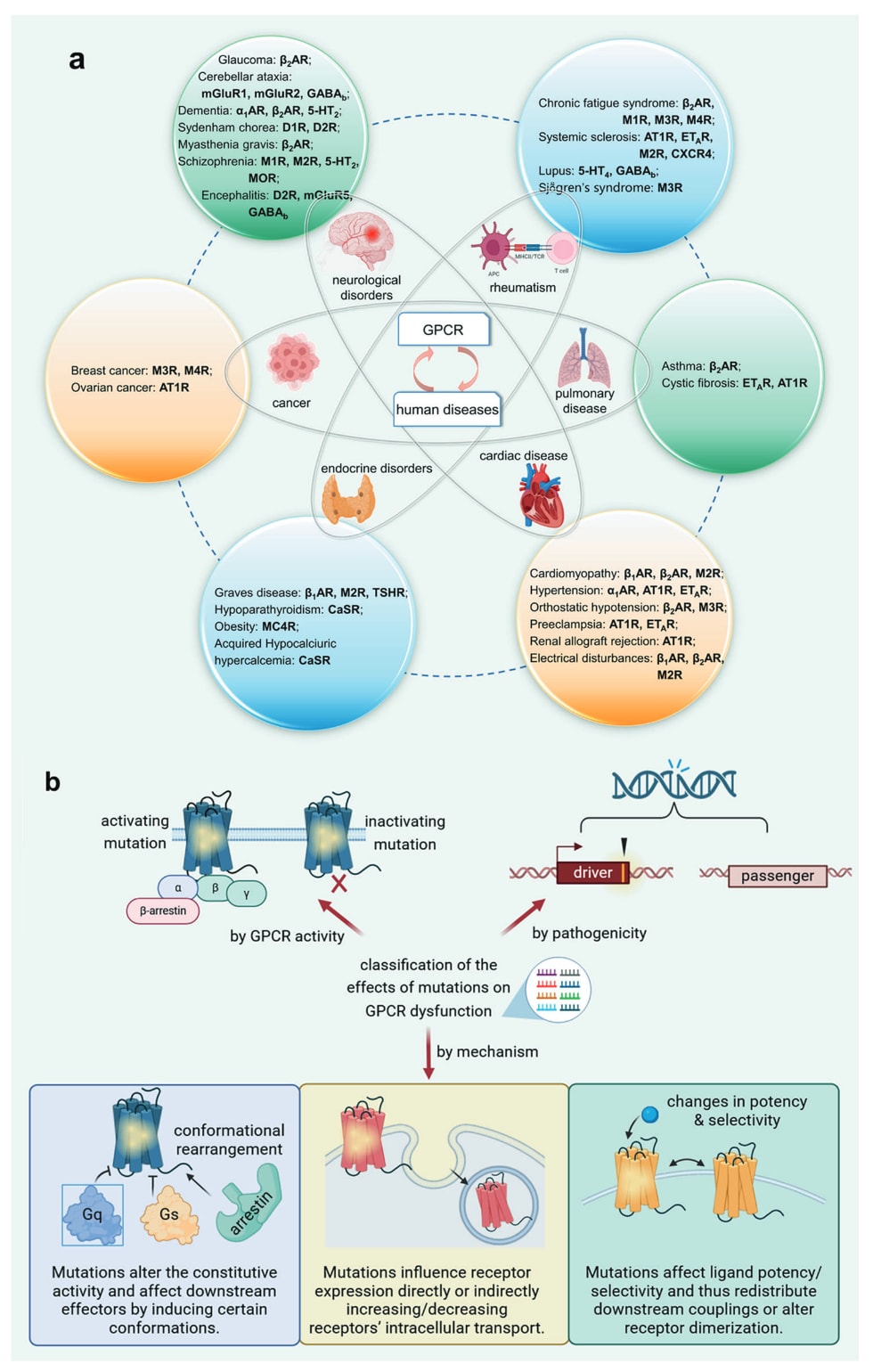 图4 a GPCR功能异常导致的人类疾病类型示例。b GPCR功能异常中突变作用的分类