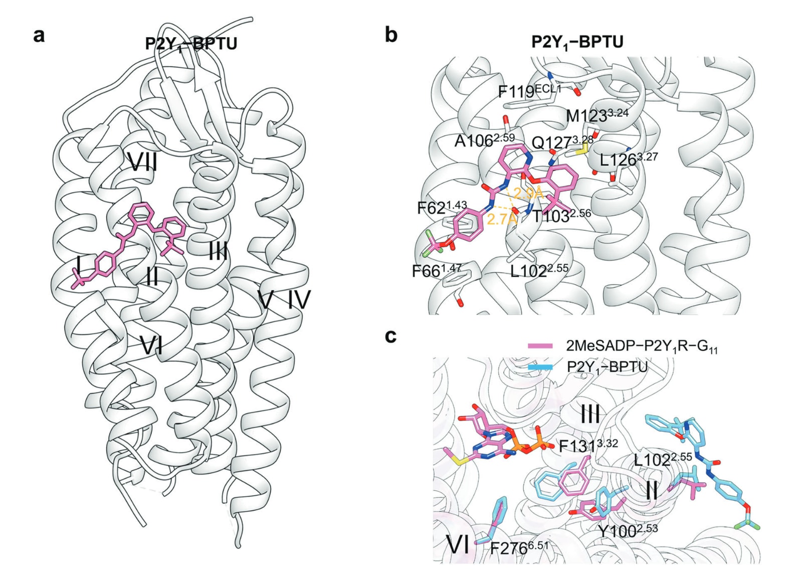 图21 a 展示了变构拮抗剂BPTU与P2Y1受体结合的示意图(PDB: 4XNV)。b 描述了BPTU与P2Y1受体的具体结合模式,其中氢键以橙色虚线表示。c 对比叠合了2MeSADP−P2Y1R−G11结构(粉色示意)与P2Y1R−BPTU结构(蓝色示意)中被重点标出的残基,展示两种配体结合下受体局部构象的差异(PDB: 7XXH与4XNV)。