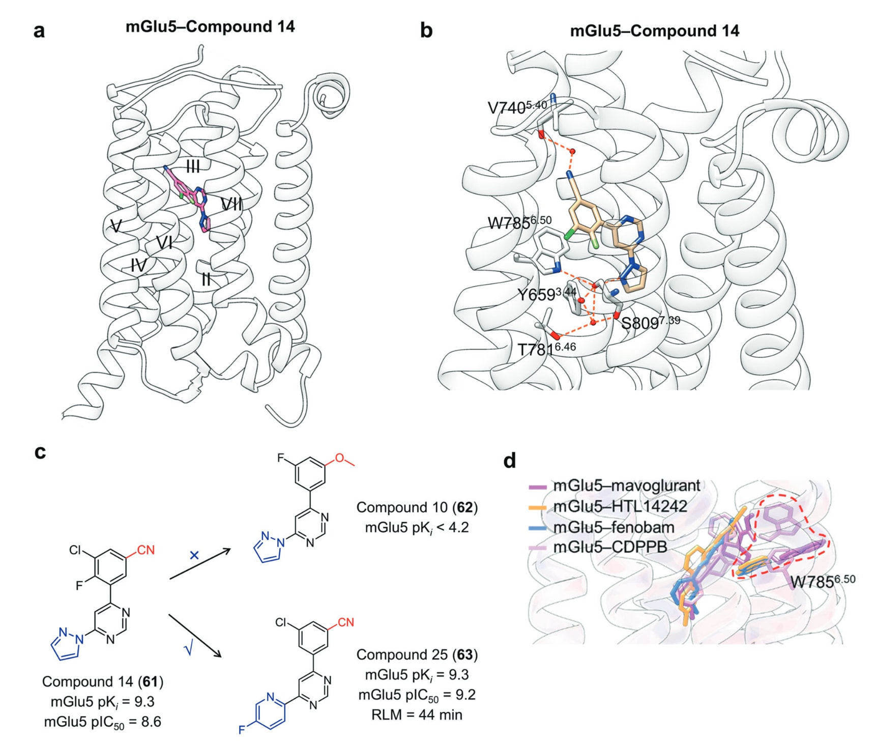 图29 a 展示了NAM fenobam与mGlu5受体结合的示意图(PDB: 5CGC)。b 描述了mGlu5受体与compound 14的详细结合模式,图中以橙色虚线标示极性相互作用。c 展示了mGlu5受体NAM的构效关系(SAR)优化过程。d 叠合展示了mGlu5–mavoglurant(紫色,PDB: 4OO9)、mGlu5–HTL14242(橙色,PDB: 5CGD)、mGlu5–fenobam(蓝色,PDB: 6FFH)以及mGlu5–CDPPB(粉色,PDB: 8TAO)结构中被重点标出的残基,用于对比不同变构配体结合下受体局部构象的差异。