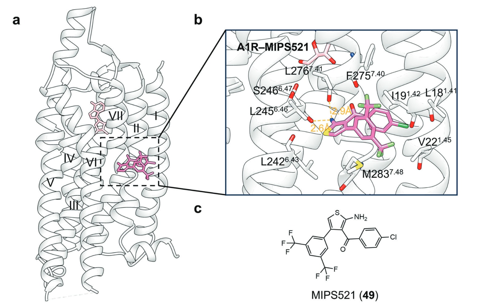 图26 a 展示了PAM MIPS521与A1R结合的示意图(PDB: 7LD3)。b 描述了MIPS521在A1R中的具体结合方式,其中氢键以橙色虚线标示。c 展示了小分子变构配体MIPS521的二维化学结构,以便更清晰理解其构成。