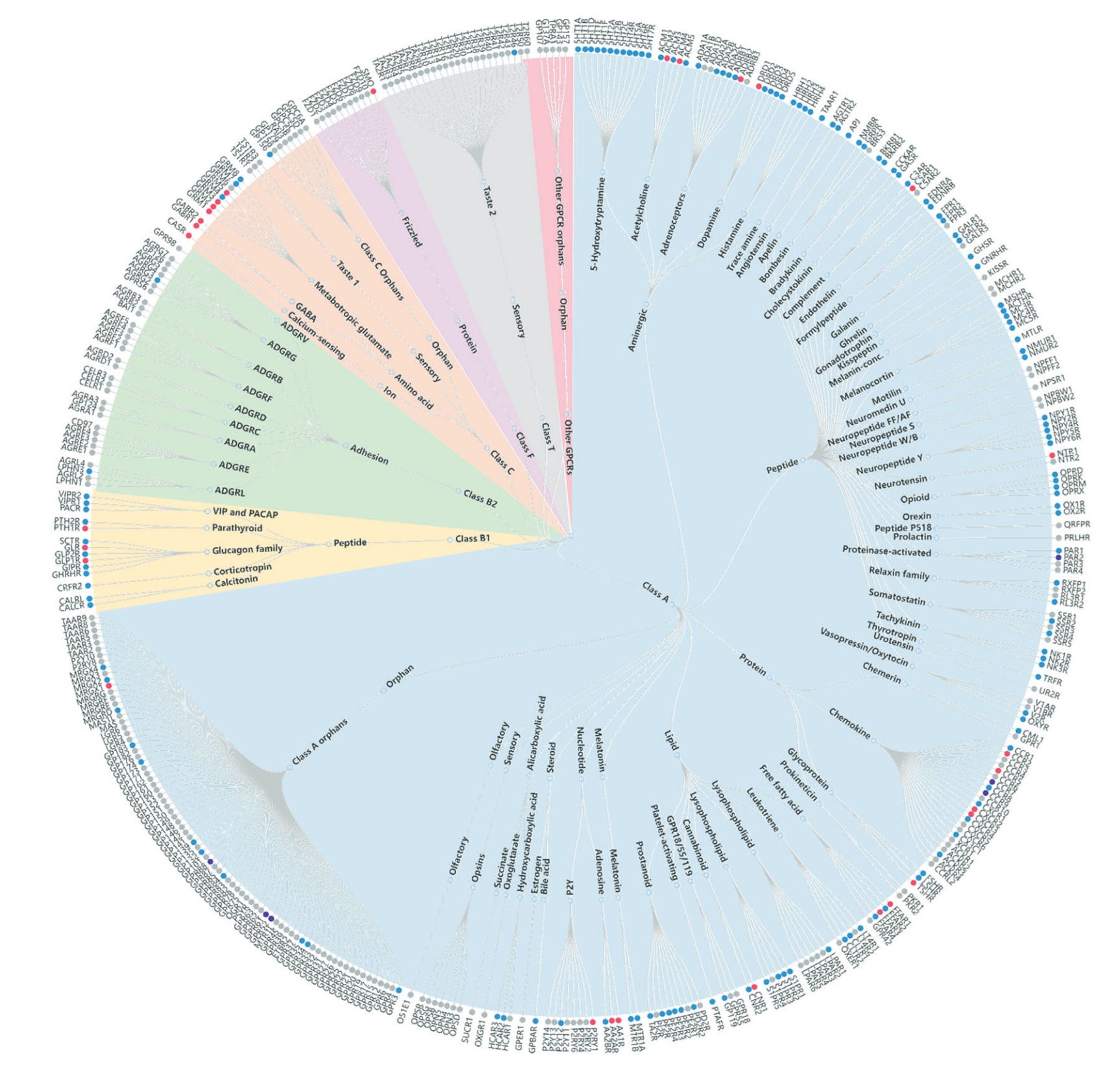 图1|GPCR系统进化树,展示已解析的与调节剂复合的GPCR结构。 节点以UniProt基因名称标注GPCR,并按照GPCR数据库的分类体系进行组织。与调节剂结合的GPCR结构以颜色标示。