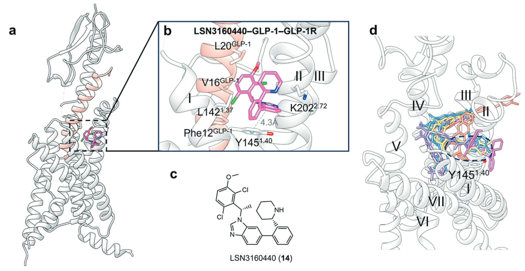 在结合口袋中,LSN3160440的苯并咪唑结构(图15c)与Leu142^1.37形成疏水互作,并与Tyr145^1.40形成芳香堆叠(图15b)。突变与MD模拟也提示,苯并咪唑N3可能通过水分子介导与Lys202^2.72形成氢键。值得注意的是,LSN3160440还能与GLP-1同时形成相互作用,发挥类似“分子胶”效应,其2,6-二氯-3-甲氧基苯基部分可同时与GLP-1的Phe12、Val16与Leu20产生疏水接触。
