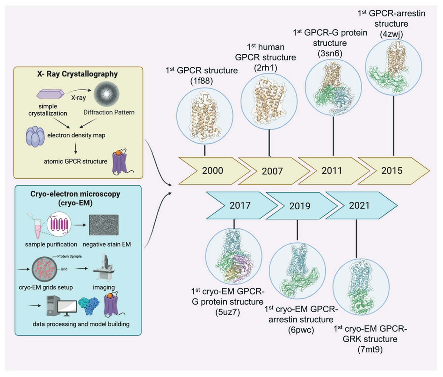 图2|使用X射线晶体学与冷冻电镜研究GPCR结构的重要进展时间线