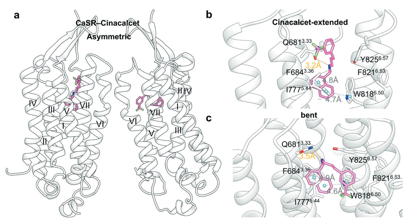 图18 a PAM cinacalcet结合CaSR的示意图(PDB: 7M3F)。b CaSR结合cinacalcet时呈“延展”构象的详细结合模式。c CaSR结合cinacalcet时呈“弯折”构象的详细结合模式,氢键以橙色虚线表示,π–π堆叠以灰色虚线表示。