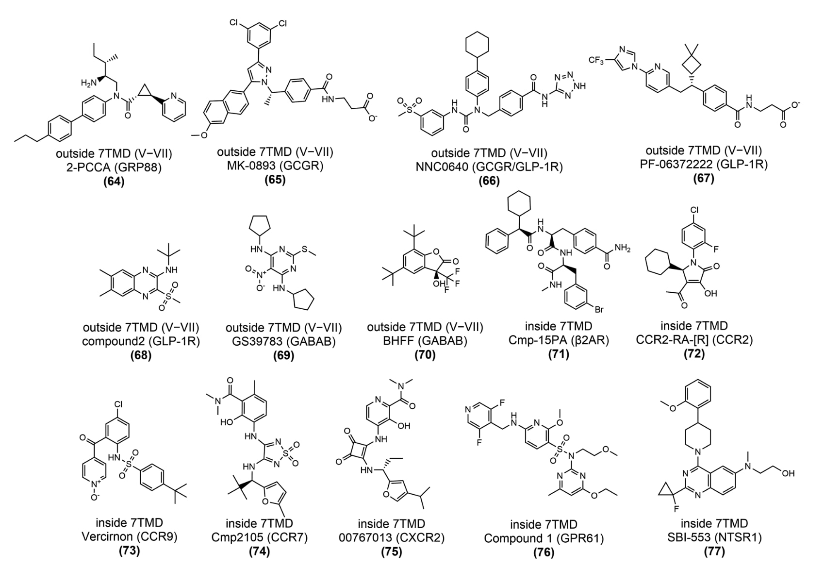 - 7TMD内部:β2AR–Cmp-15PA、CCR2–CCR2-RA-[R]、CCR9–vercirnon、CCR7–Cmp2105、CXCR2–00767013、GPR61–Compound 1与NTSR1–SBI-553结构