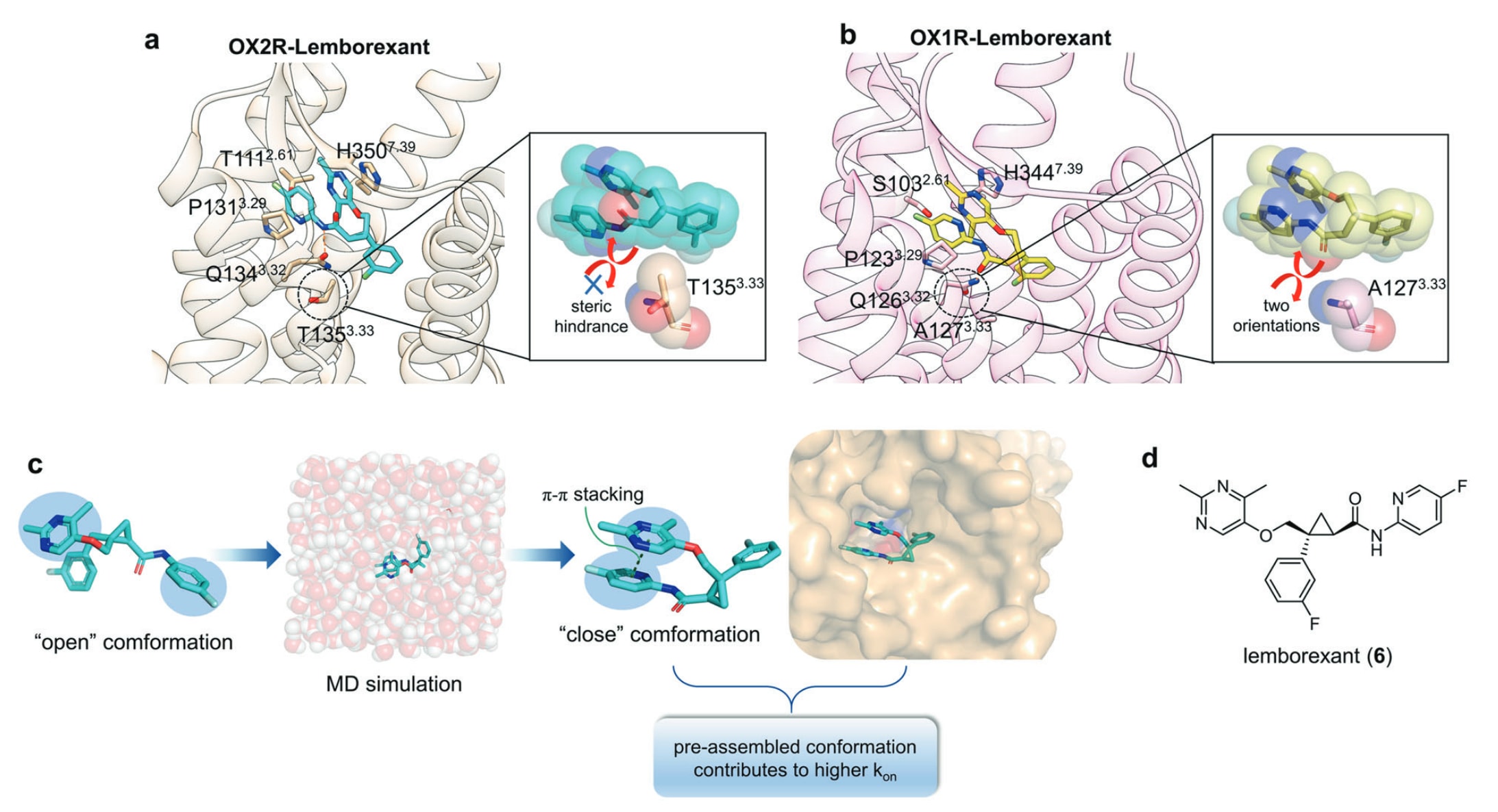 图7 a OX2R−lemborexant复合物的详细结合模式(受体:浅橙色,配体:青色,PDB: 7XRR),其中Thr135^3.33的空间阻碍仅允许配体以单一取向结合。b OX1R−lemborexant复合物的结合模式(受体:浅粉色,配体:黄色,PDB: 6TOT),其中Ala127^3.33侧链较小,使配体能够以两种取向结合。c 通过MD模拟预测配体在与受体结合前的构象,以提升kon值的示意图。d lemborexant的二维结构示意图。