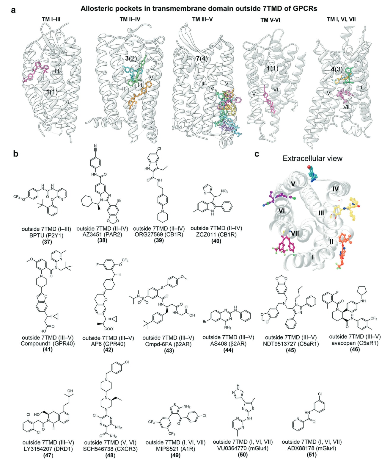从已解析的结构来看,GPCR可利用位于7TMD外侧、紧邻脂质界面的跨膜结构域区域来结合变构调节剂。迄今为止,已有五类位于7TMD外侧的跨膜变构位点被结构学明确界定(Table 2),分别位于:I–III螺旋外侧、II–IV螺旋外侧、III–V螺旋外侧、V–VI螺旋外侧,以及I、VI、VII螺旋外侧(图20a、c)。这些位点主要出现在A类GPCR中。