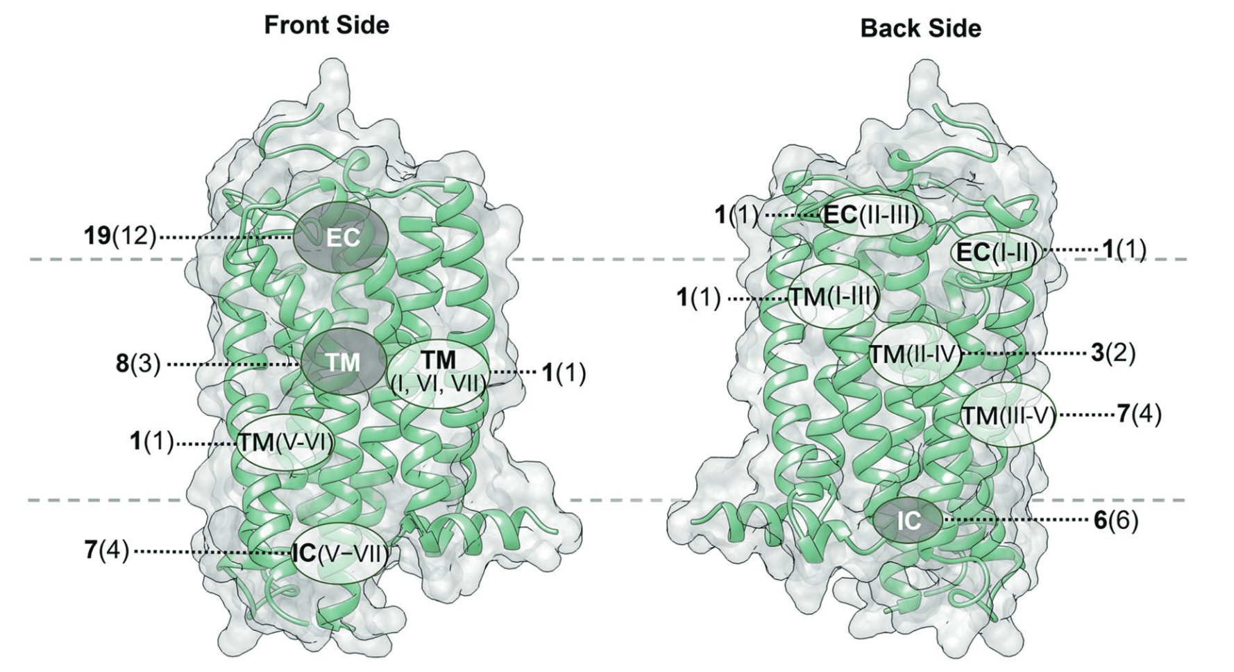 图12|在GPCR中已报道的11个变构结合位点映射至代表性A类GPCR CB1R结构。 灰色区域表示7TMD内部的结合口袋,白色区域表示7TMD外侧的结合口袋。每个口袋旁以黑体标注该口袋中已知的独特配体数量,并在括号中标明含有该口袋的GPCR数量。灰色虚线表示脂双层的边界。