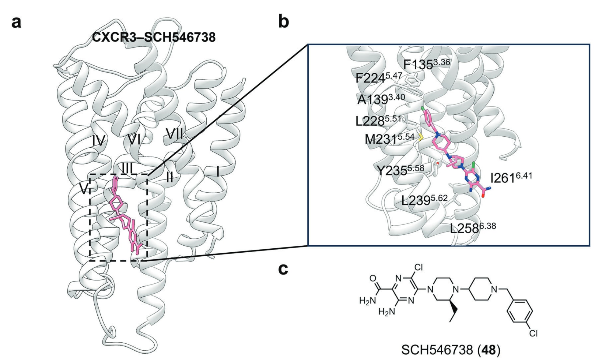 图25 a 展示了变构拮抗剂SCH546738与CXCR3结合的示意图(PDB: 8HNN)。b 描述了SCH546738在CXCR3中的详细结合模式,包括其在疏水口袋中的定位与关键相互作用。c 为SCH546738的小分子二维结构,以辅助理解其化学骨架与结合构象。