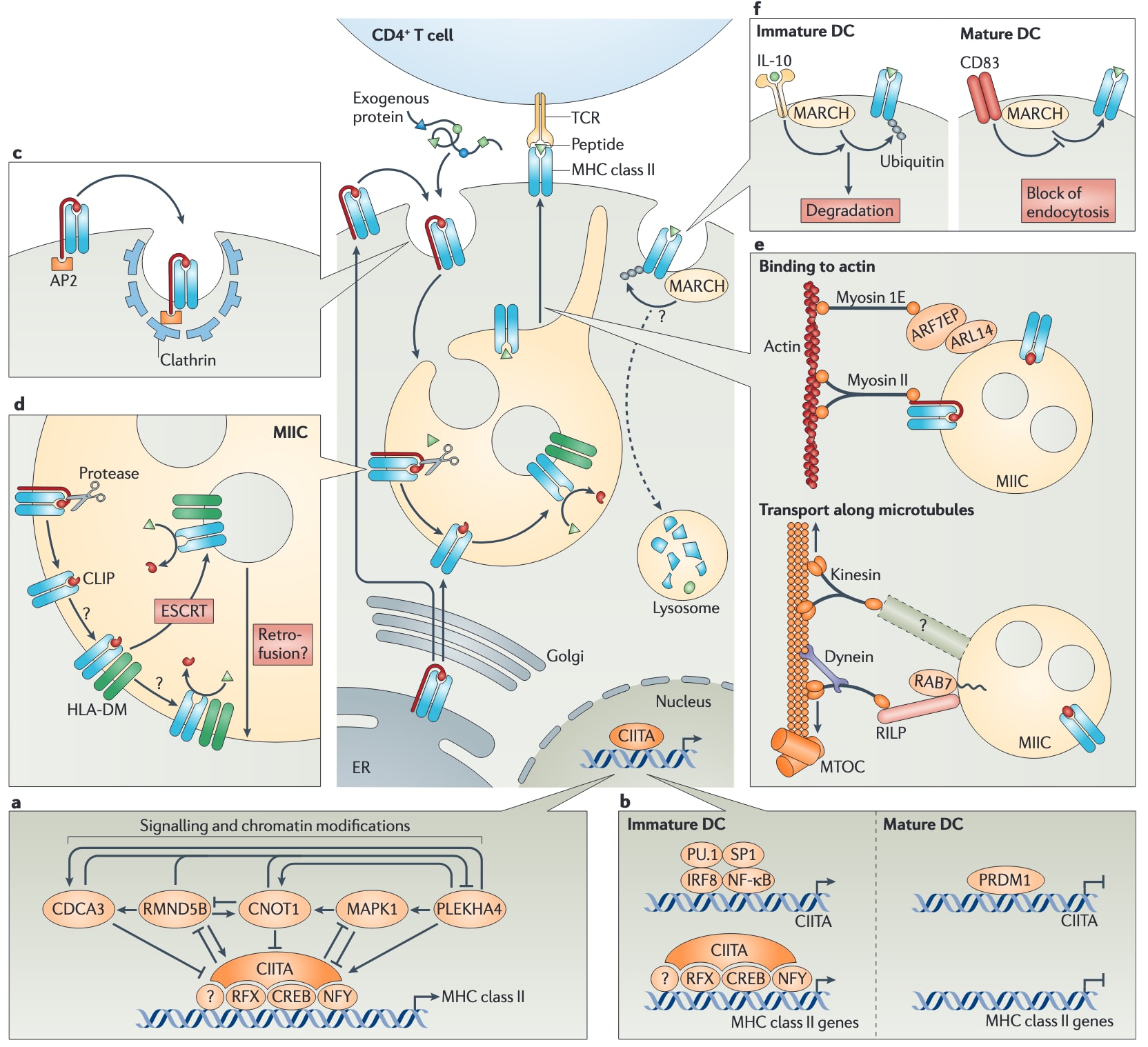 图4|MHCⅡ类抗原呈递通路的复杂性。 图中以多个模块展示了对MHCⅡ类通路各个步骤的认识,并将其投射到MHCⅡ类抗原呈递的基本通路之上。a|MHCⅡ类基因的转录受主调控因子MHCⅡ类转录激活因子CIITA控制,从而保证其组织特异性表达。CIITA的表达又受到一个反馈调控回路的影响,而这一回路进一步受两类普遍过程调节,即信号传导和染色质修饰。b|在未成熟树突状细胞中,CIITA的表达由一个激活性转录复合体调控,其中包含PU.1、SP1、IRF8和NF-κB;而在成熟树突状细胞中,CIITA则受到PR结构域锌指蛋白1(PRDM1)的抑制。因此,CIITA会与其他因子一起在未成熟树突状细胞中诱导MHCⅡ类基因转录,但在成熟树突状细胞中则不会。c|衔接蛋白AP2驱动Ii-MHCⅡ类复合物在质膜处进入网格蛋白包被小泡,并被运送至MHCⅡ类区室MIIC。d|在MIIC中,Ii被降解,MHCⅡ类分子随后与HLA-DM相互作用。大多数HLA-DM和MHCⅡ类分子定位并相互作用于由胞质侧内体分选复合体ESCRT machinery形成的内部结构中。位于内部的HLA-DM和MHCⅡ类分子是否会通过“逆向融合”返回到MIIC外膜,目前仍不清楚。e|MIIC或其管状延伸结构通过依赖微管的马达蛋白dynein和kinesin被运输至细胞膜。这些马达蛋白具有定位于MIIC的受体,例如作为dynein马达受体的RAB7相互作用溶酶体蛋白RILP。最终一步则涉及依赖肌动蛋白的肌球蛋白马达,它们可通过Ii与MIIC结合,因为Ii可与myosin II结合;也可通过GTP酶ADP-核糖基化因子样蛋白14(ARL14)与MIIC结合,后者会招募效应蛋白ARF7EP,而ARF7EP可作为马达蛋白myosin 1E的受体。后一种机制调控未成熟树突状细胞中的MIIC分泌。f|在未成熟树突状细胞中,MHCⅡ类分子自质膜的内吞可能需要泛素连接酶MARCH1参与,而MARCH1又受白细胞介素-10(IL-10)调控。成熟树突状细胞表面的CD83能够阻止MHCⅡ类分子的这种泛素化,从而稳定细胞表面的MHCⅡ类分子。CDCA3,细胞分裂周期相关蛋白3;CNOT1,CCR4-NOT转录复合体亚基1;CREB,cAMP反应元件结合蛋白;IRF8,干扰素调节因子8;MAPK1,丝裂原活化蛋白激酶1;NF-κB,核因子-κB;NFY,核转录因子Y;PLEKHA4,含pleckstrin同源结构域家族A成员4;RFX,调节因子X;TCR,T细胞受体。