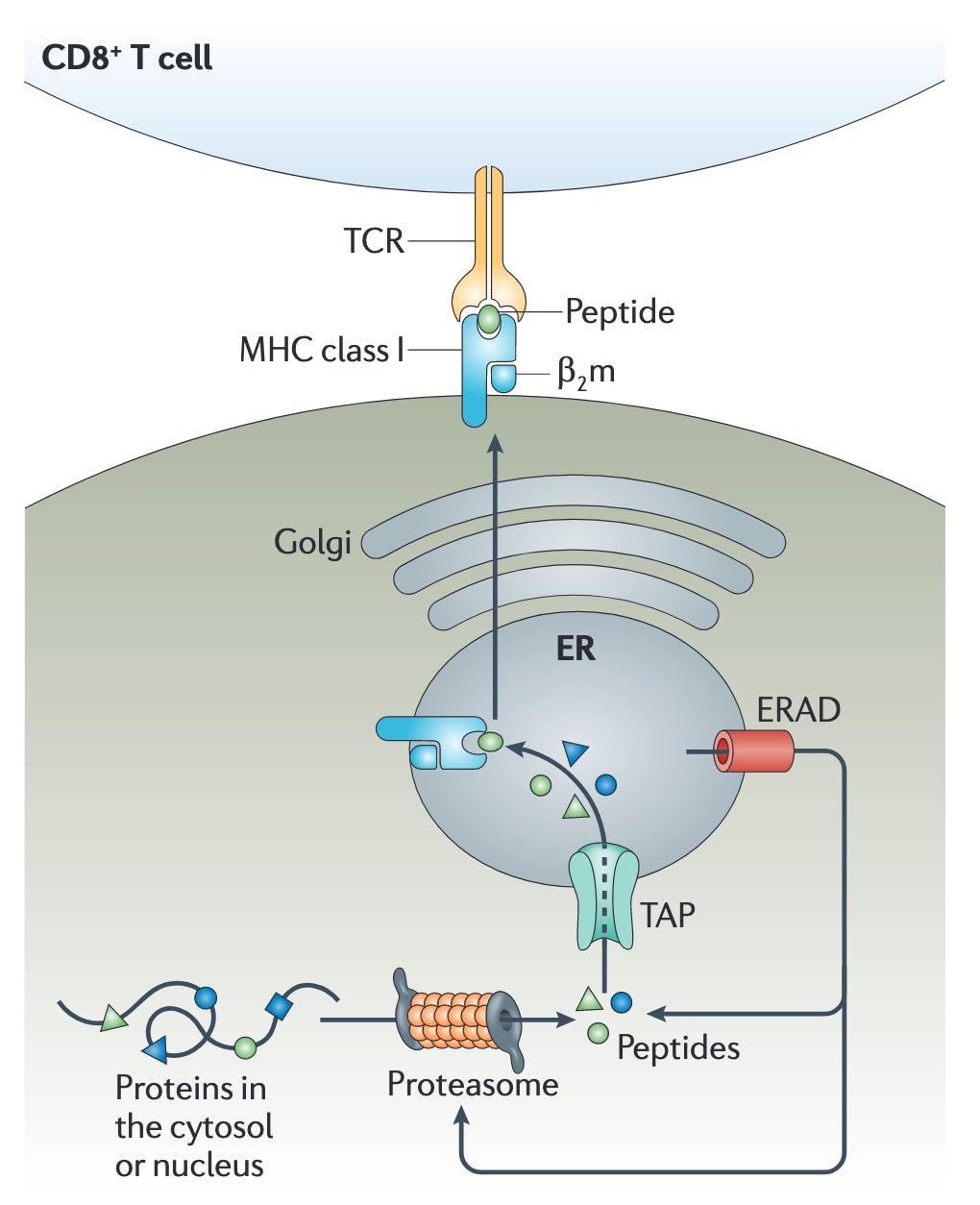 图1|MHCⅠ类抗原呈递的基本通路。 MHCⅠ类分子对细胞内抗原肽的呈递,是由一系列连续反应共同完成的。首先,抗原在蛋白酶体中被降解。随后,产生的肽段通过抗原加工相关转运体TAP被转运至内质网(ER)腔内,并装载到MHCⅠ类分子上。形成的肽-MHCⅠ类复合物随后从内质网释放,经高尔基体运输至质膜,最终在细胞表面呈递给CD8+T细胞。β2m,β2-微球蛋白;ERAD,内质网相关蛋白降解;TCR,T细胞受体。