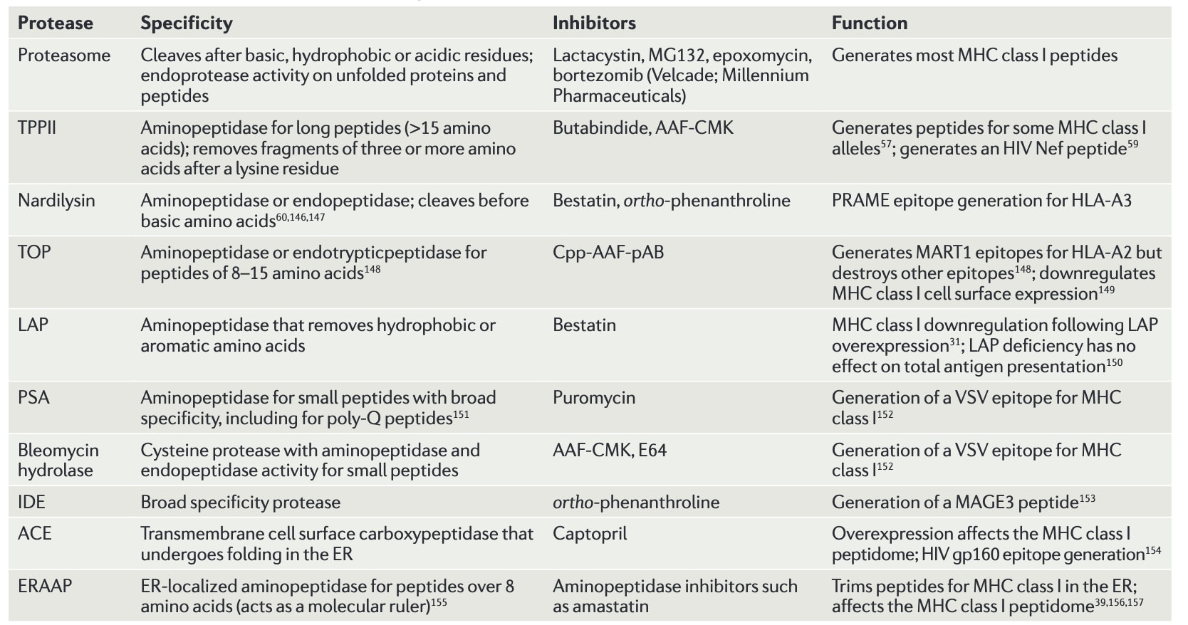 这一现象之所以可能,是因为肽段在活细胞胞质中的半衰期仅有6到10秒。这意味着绝大多数肽段在接触TAP之前就已经被降解,从而避免了呈递队列的形成。胞质中的肽段会被多种氨肽酶降解。三肽基肽酶II即TPPII以及neurolysin能够切割较大的肽片段。较小的8至15个氨基酸长度的肽段则主要由TOP处理,更短的肽段则由其他几种肽酶继续分解。缺失这些肽酶的小鼠通常并不会表现出整体抗原呈递的明显异常。这可能是因为不同肽酶之间能够相互补偿,而不够精确的N端修剪也总可以由内质网氨肽酶ERAAP进一步校正。不过,尽管这些胞质肽酶对整体肽库并非必需,它们对于某些特定MHCⅠ类肽段的生成却是不可缺少的。