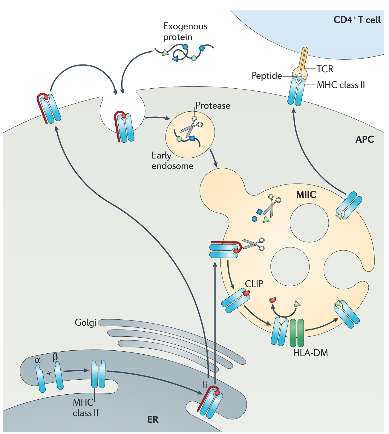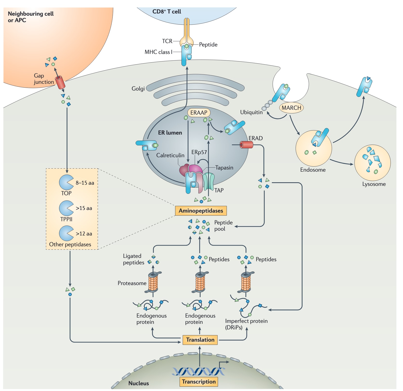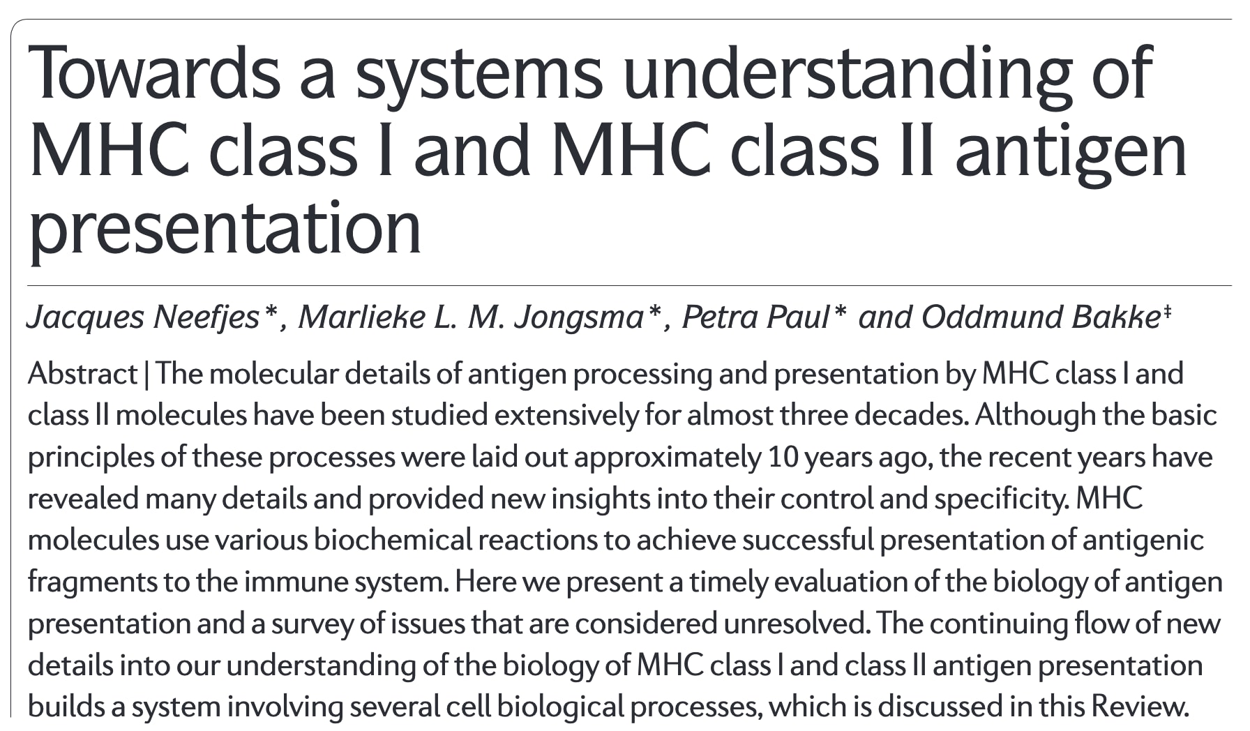 Neefjes, J.; Jongsma, M. L. M.; Paul, P.; Bakke, O. Towards a Systems Understanding of MHC Class I and MHC Class II Antigen Presentation. Nature Reviews Immunology 2011, 11 (12), 823–836. https://doi.org/10.1038/nri3084.