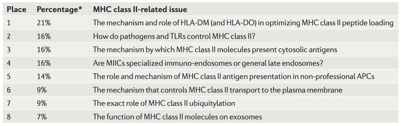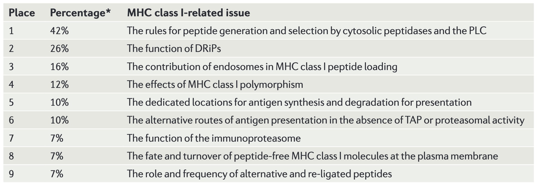 与此同时,对MHCⅠ类和MHCⅡ类抗原呈递的认识已经能够,而且事实上也正在被转化为治疗策略。随着对这些分子介导抗原呈递机制理解的不断加深,未来有望发现更多可用于治疗性调控免疫系统的新靶点。近来,许多研究团队已经揭示了抗原加工与呈递系统中的新步骤。然而,这一领域仍存在大量未知和争议,文中表2和表3结合MHCⅠ类与MHCⅡ类生物学领域专家的意见,对这些问题进行了总结。当前仍难以判断免疫优势肽是否可以被准确预测,也尚不清楚为什么某些特定的MHCⅠ类或MHCⅡ类等位基因会与自身免疫病相关。较为明确的例外是麸质、HLA-DQ2和HLA-DQ8与乳糜泻之间的已知联系。对于这些核心问题,未来几年有望逐步获得更清晰的答案。